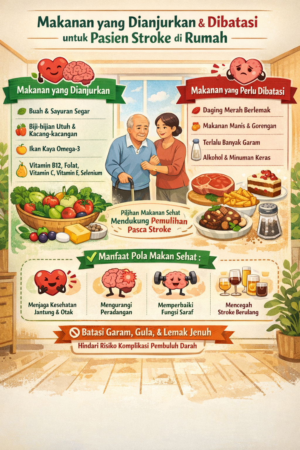 Beberapa prinsip penting terkait makanan yang dianjurkan dan dibatasi untuk pasien stroke meliputi: