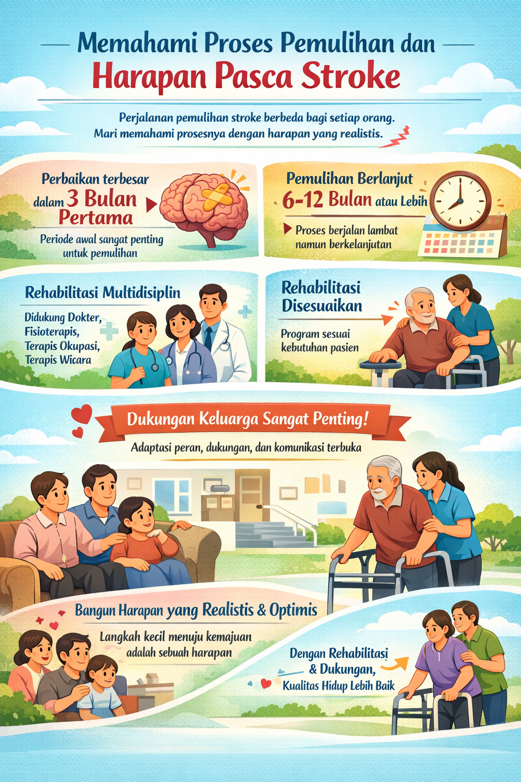 Pemulihan setelah stroke merupakan sebuah perjalanan yang berbeda bagi setiap individu. Tidak ada dua pasien stroke yang mengalami proses pemulihan dengan cara yang sama. Hasil pemulihan sangat dipengaruhi oleh tingkat keparahan stroke, area otak yang terdampak, serta kondisi kesehatan pasien secara keseluruhan. Dengan memahami bahwa pemulihan adalah proses jangka panjang, pasien dan keluarga dapat lebih siap menghadapi berbagai tantangan, sekaligus menumbuhkan harapan yang realistis di setiap tahap perawatan.