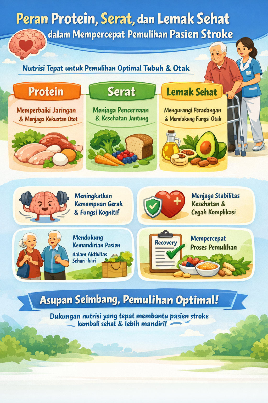 Penelitian menunjukkan bahwa kecukupan protein berperan penting dalam menjaga kekuatan otot dan mendukung perbaikan fungsi gerak serta kemampuan berpikir pasien stroke. Serat yang berasal dari sayuran dan sumber nabati lainnya membantu menjaga kesehatan pencernaan dan memberikan perlindungan terhadap risiko penyakit kardiovaskular. Sementara itu, lemak sehat seperti asam lemak tak jenuh mendukung kesehatan pembuluh darah dan fungsi neurologis yang optimal. Ketika ketiga nutrisi ini dipenuhi secara seimbang, proses rehabilitasi dapat berjalan lebih efektif dan hasil pemulihan menjadi lebih baik.
