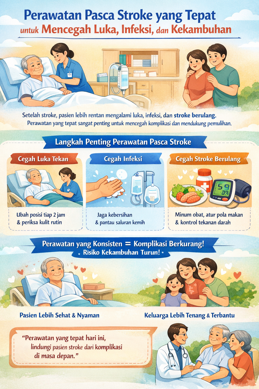 Pada akhirnya, pencegahan luka, infeksi, dan stroke berulang bukanlah hasil dari satu tindakan besar, melainkan akumulasi dari perawatan kecil yang dilakukan secara konsisten setiap hari. Dengan kolaborasi yang baik antara pasien, keluarga, dan tenaga kesehatan, pemulihan pasca stroke dapat berjalan lebih aman dan berkelanjutan.